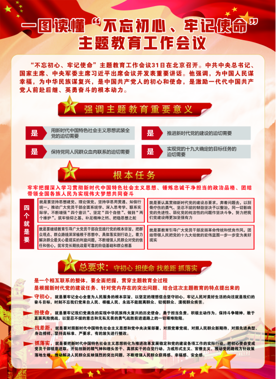 由集團黨委副書記、總經理劉玲同志宣讀《集團黨委開展"不忘初心、牢記使命"主題教育實施方案》。集團黨委書記、董事長王玉輝同志作了"不忘初心、牢記使命"主題教育動員講話,對集團系統開展主題教育工作進行了安排部署,要求把主題教育與完成本單位轉型升級、項目建設、生產經營等工作任務結合起來,切實把主題教育成果轉化為企業發展的強大動力,推動青海物產高質量發展。省委"不忘初心、牢記使命"主題教育第十二巡回指導組組長任正德同志做了指導講話。充分肯定了集團黨委的前期工作,認為會議準備比較充分,有效統一了干部職工的思想,制定的主題教育《實施方案》操作性強,目標任務具體,動員講話政治站位高,思想認識深,工作思路清晰。同時,結合工作組的職責就落實主題教育各項任務講了六點意見。一是聚焦根本任務;二是把握"十二"字總要求;三是緊扣"五句話"總目標;四是落實"四個貫穿";五是抓實"六項重點"舉措;六是力戒形式主義,嚴禁主題教育走形式、走過場。