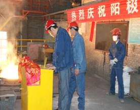 2012年7月7日上午11點零19分,青海物產(chǎn)工業(yè)投資有限公司10萬噸電解鋁/年升級改造項目,簡易陽極組裝車間大門前鞭炮齊鳴。青海物產(chǎn)工業(yè)投資有限公司黨總支副書記、青海長春炭素有限公司總經(jīng)理王松華,公司常務(wù)副總經(jīng)理、項目副總指揮常海寧,工業(yè)投資和長春炭素公司副總經(jīng)理姜紅萍,公司副總經(jīng)理張秉瑜,總經(jīng)理助理范登福等公司領(lǐng)導(dǎo)和各車間、部室的職工出席了簡單的點火澆鑄儀式。王松華同志按下了點火按鈕鄭重宣布澆鑄正式開始。當(dāng)中頻爐工將第一爐鐵水倒入抬包時,標志著新陽極組裝車間正式投產(chǎn)運行。