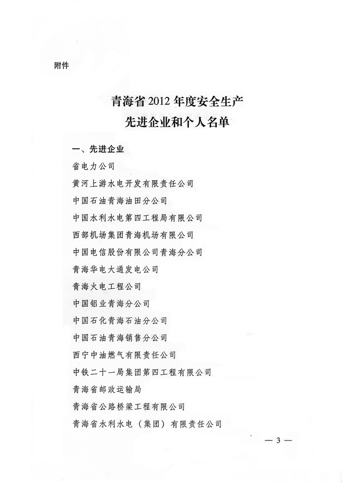 2012年,在省委、省政府的正確領(lǐng)導(dǎo)下,青海省物產(chǎn)集團(tuán)總公司認(rèn)真學(xué)習(xí)貫徹黨的十八大精神,全面貫徹落實(shí)科學(xué)發(fā)展觀(guān),牢固樹(shù)立以人為本、安全發(fā)展的理念,深入開(kāi)展"安全生產(chǎn)年"、"隱患排查治理"、"打非治違"等活動(dòng),為促進(jìn)全省安全生產(chǎn)形勢(shì)持續(xù)穩(wěn)定好轉(zhuǎn)做出了積極貢獻(xiàn)。為此,經(jīng)省政府同意,省安全生產(chǎn)委員會(huì)決定授予青海省物產(chǎn)集團(tuán)總公司"2012年度安全生產(chǎn)先進(jìn)企業(yè)"榮譽(yù)稱(chēng)號(hào)。